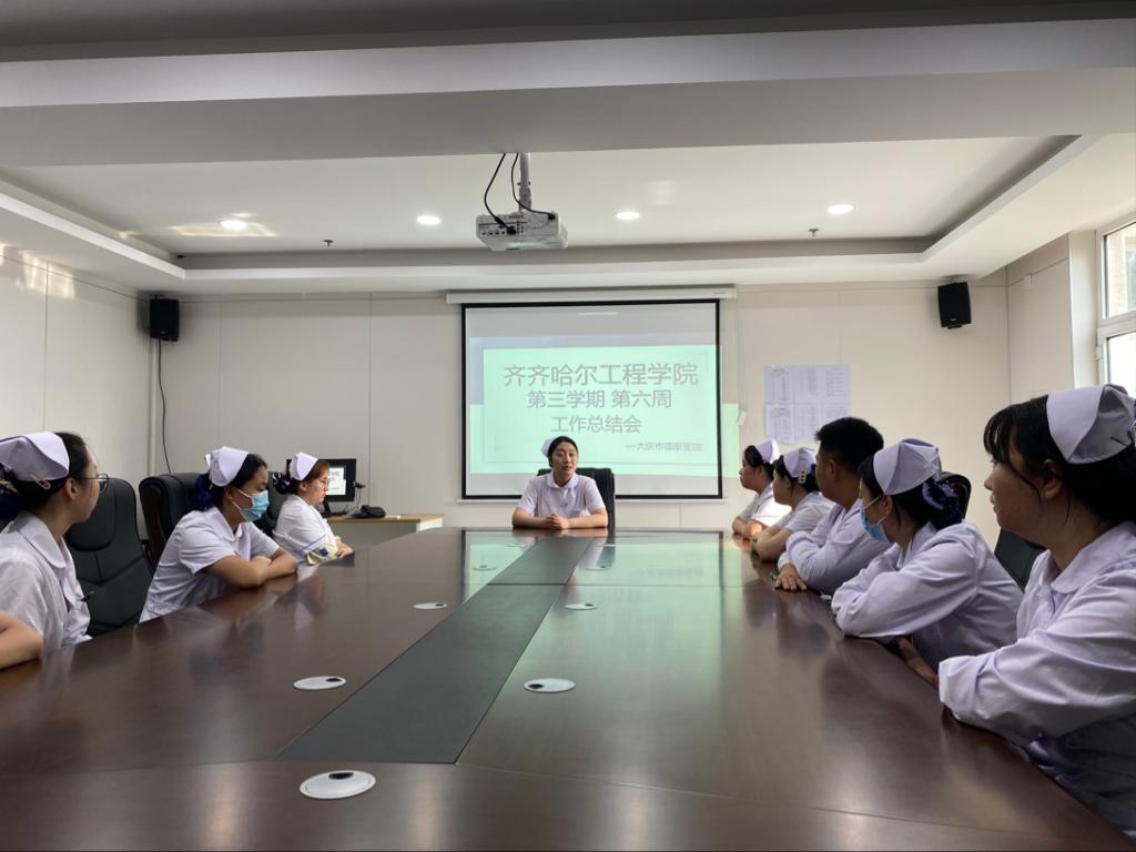 7月26日于大庆市德康医院三楼会议室,护理部主任王芳开展【专业实践学期】冯蕾老师组第六周工作总结大会。