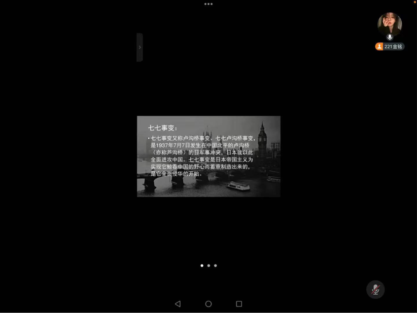 会议伊始,在金铭同学的带领下观看《七七事变纪录片》从中了解到,2023年7月7日是"七七事变"爆发86周年纪念日。86年前的今天,日军诡称一名士兵失踪,悍然向卢沟桥和宛平城发起猛烈进攻,日本全面侵华战争爆发。面对侵路者的铁蹄践踏,一大批中华儿女冒着敌人的炮火,一往无前、共赴国难,千千万万爱国将士浴血奋战、视死如归,用生命铸就民族复兴的丰碑。