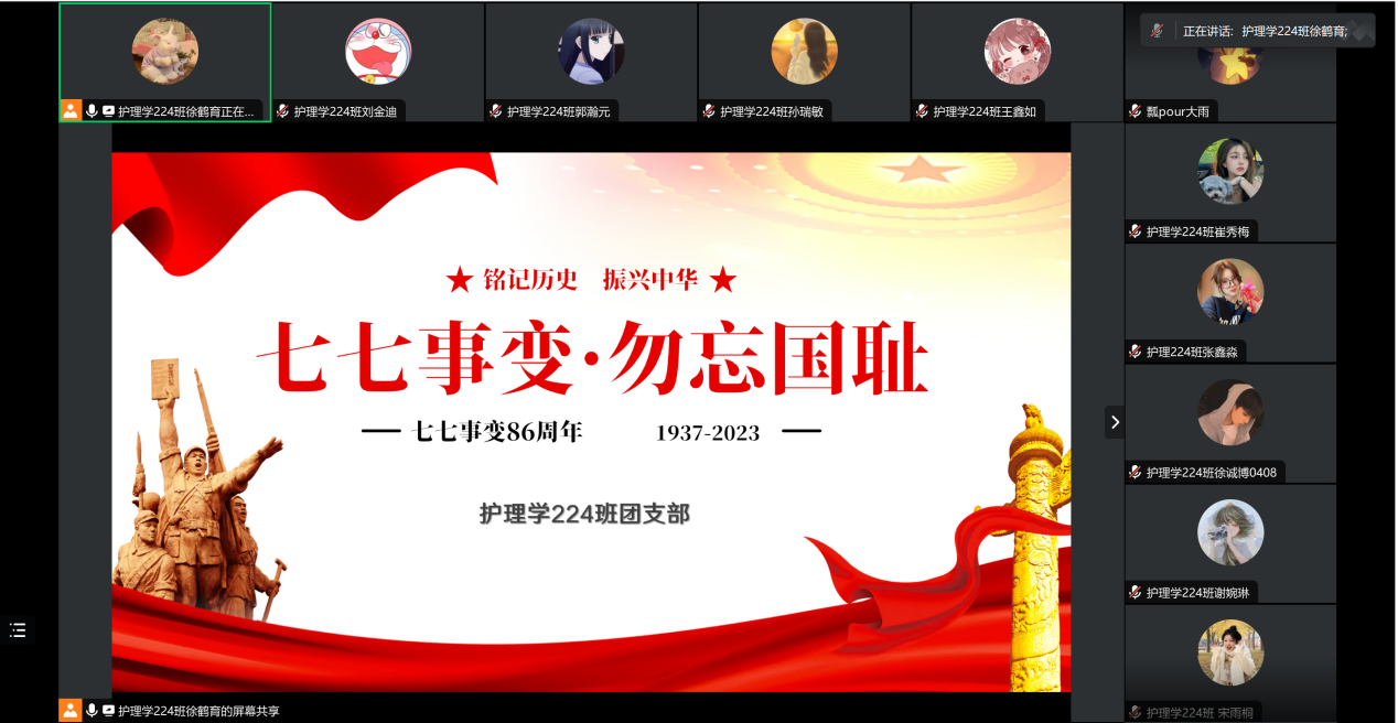 为了更深刻的让同学们了解抗日战争,也为了让同学们不忘国耻,好好学习,居安思危,培养同学们的爱国热情,2023年7月7日,健康与护理系护理学224班开展了“七七事变,勿忘国耻”主题团日活动,43名同学全体参加。