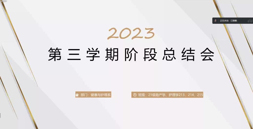 2023年7日6日,护理学214班于线上腾讯会议组织开展“第三学期阶段总结会”主题班会,由辅导员江丽娜组织开展,护理学214班全体同学参加。