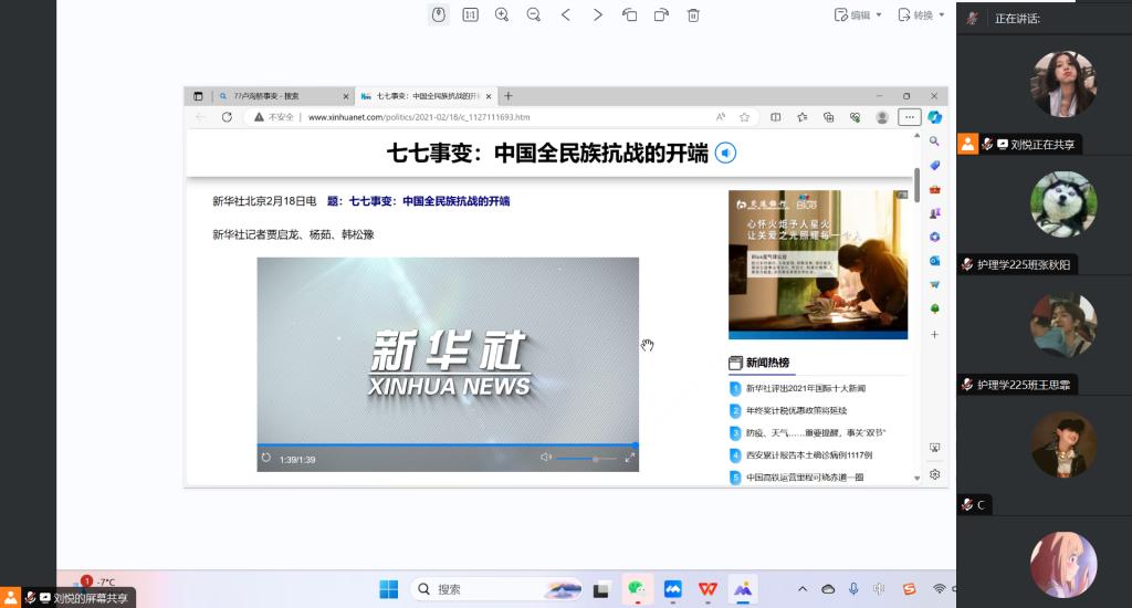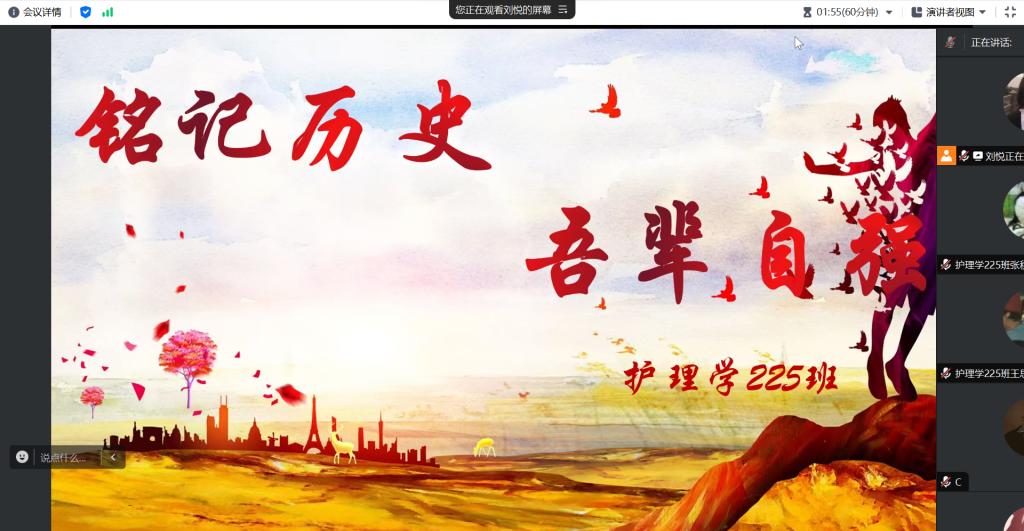 为了怀念英勇烈士,传承爱国主义精神,并提高学生的历史责任感,健康与护理系护理学225班在2023年7月7日通过腾讯会议举办了“铭记历史,吾辈自强”的主题团活。此次会议由团支书刘悦主持,护理学225班全班同学均积极参与。