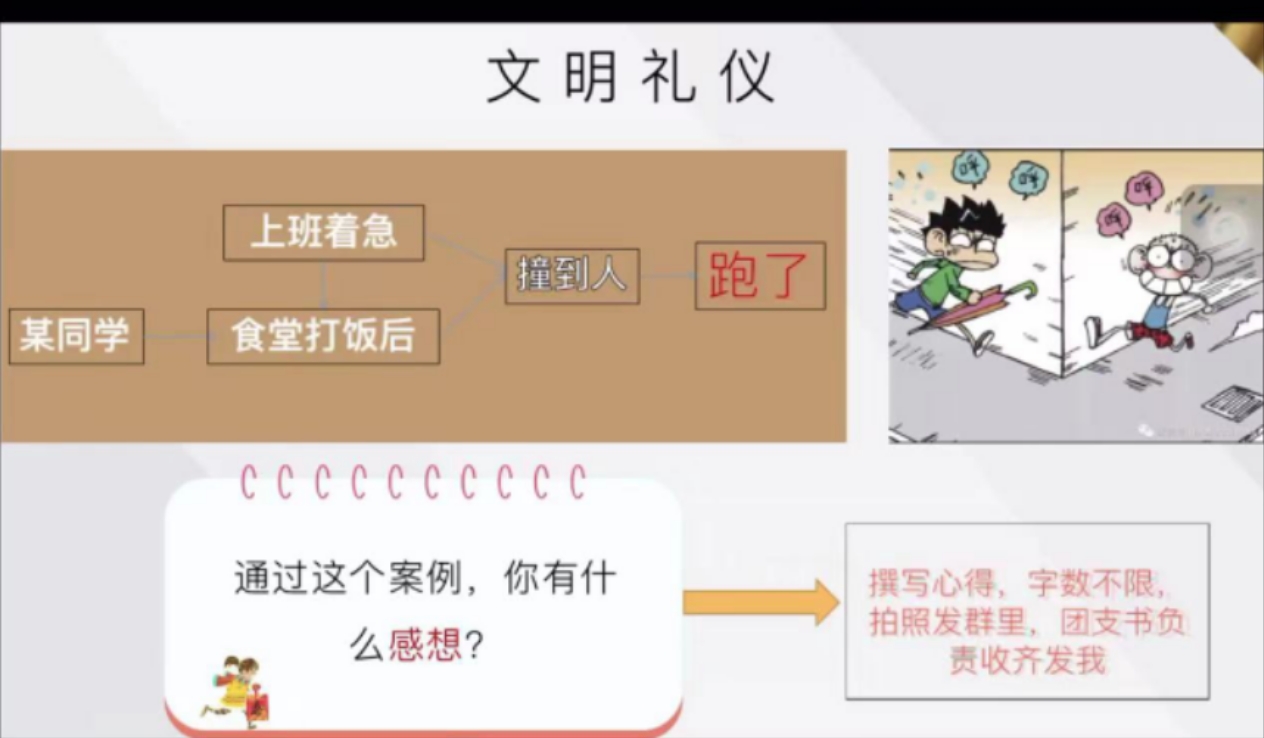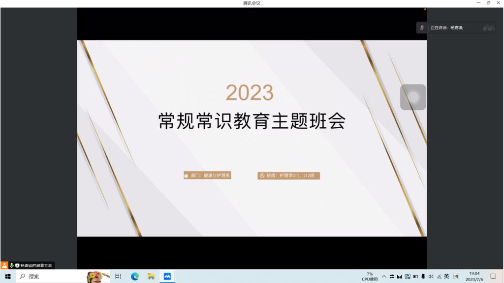 为了规范同学们在校的行为,强调文明礼仪素养,营造和谐的校园氛围。2023年7月6日,护理学211、212班于线上组织开展“常规常识教育”主题班会。本次会议由辅导员杨嘉琪主持,护理学211班全体同学参加。