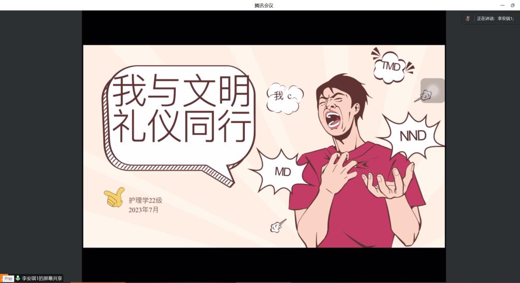 为进一步引导学生树立道德观念,成为文明有礼的新时代大学生,2023年7月4日18:00,护理学2022级组织开展文明礼貌主题班会,会议由辅导员老师李安琪主持,护理学2022级全体同学参加。
