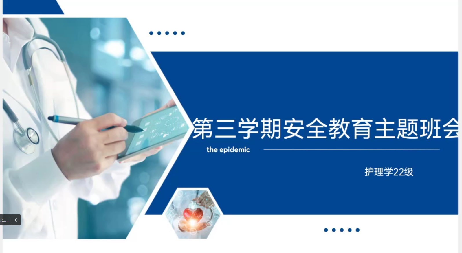 为增强同学们的安全意识,加强自我保护能力,护理学22级于2023年6月19日19:30在腾讯会议召开第三学期安全教育班会,本次会议由辅导员李安琪主持,护理学22级全体同学参加。