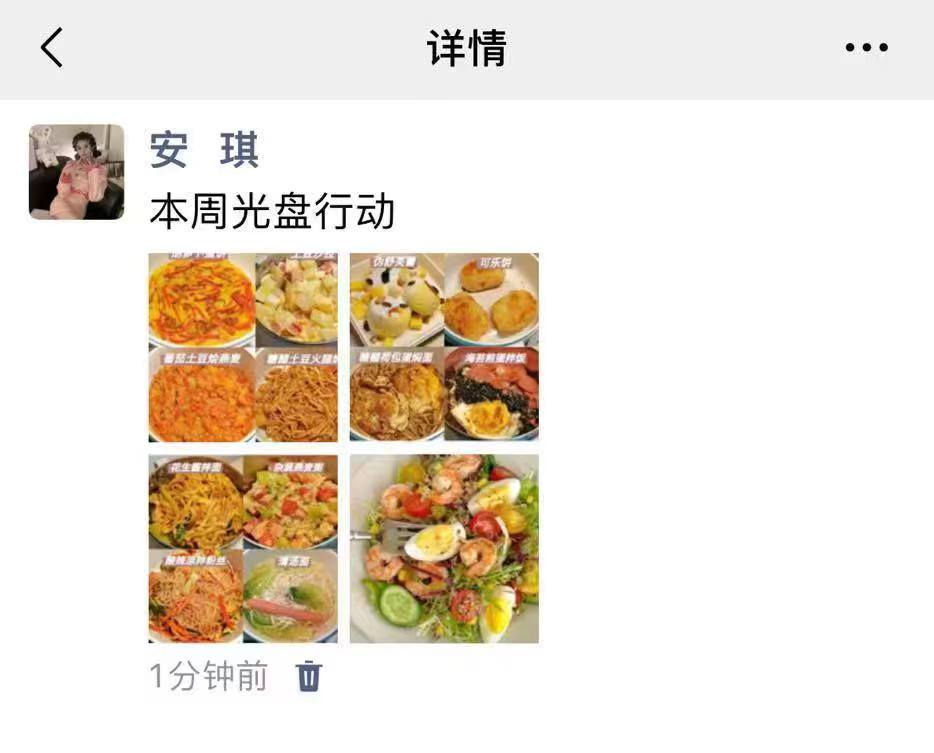 活动伊始,团总支部下发活动要求,同学们以高涨热情积极参加,纷纷将生活中的日常饮食食谱晒在朋友圈中,分享自己的食谱,在活动营养周中,学生们记录每日膳食,开展我与膳食打卡活动,积极宣传,介绍膳食内容,宣扬合理饮食、杜绝浪费的良好习惯养成,同时记录美好生活。活动最后,负责人将同学们的膳食食谱记录下来,看到了同学们健康的饮食生活,自此,活动圆满结束。