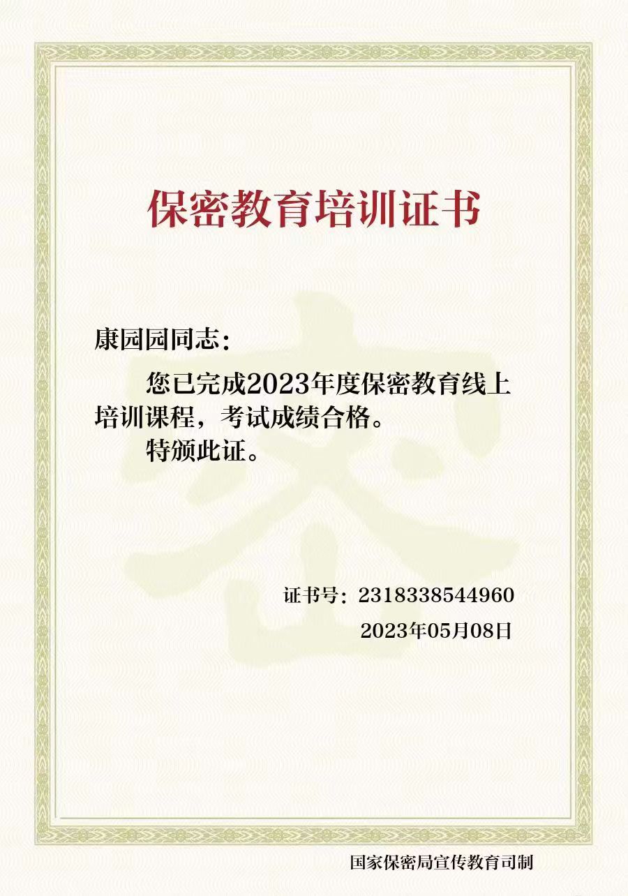 此次培训围绕保密法律法规、保密知识常识、保密技术防范和保密警示案例,使同学们直观地了解到日常学习、生活中可能存在的泄密隐患,对保障国家秘密和个人信息安全有了更深刻的认识。大家主动学习并按时完成答题。测试采取线上的形式,内含单项选择题、多项选择题等,全面考查学生对保密法的学习掌握情况。学生们在繁忙的学习之余积极学习、认真观看教育视频。答题过程中仔细审题、有效作答。答题完毕后全天随时上传答题情况,并附培训证书。
