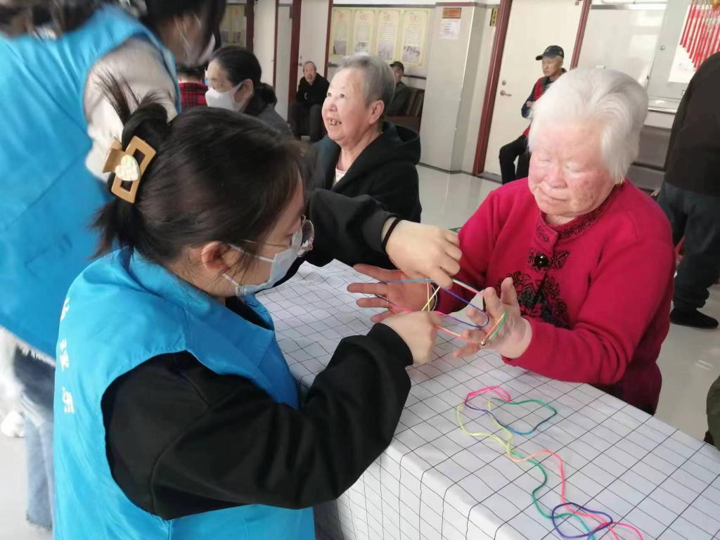 志愿服务是指在不求回报的情况下,为改善社会,促进社会进步而自愿付出个人的时间及精力所作出的服务工作。奉献精神是高尚的,是志愿者服务精神的精髓。志愿者通过参与志愿服务,促进了社会的进步,同时自身也得到了很大提升。我们作为大学生也应该参与到其中,我们来到了齐齐哈尔夕阳红托养院开展了志愿服务活动,主题为“翻手绳”。翻手绳需要眼睛仔细观察分辨纵横交错的线条,需要大脑记忆操作的顺序与方法,需要手指灵巧准确地协同操作,必须做到眼尖、脑灵、手巧,手脑一致,手眼协调。无形中视觉、触觉、运动觉、知觉得到了有机的训练。