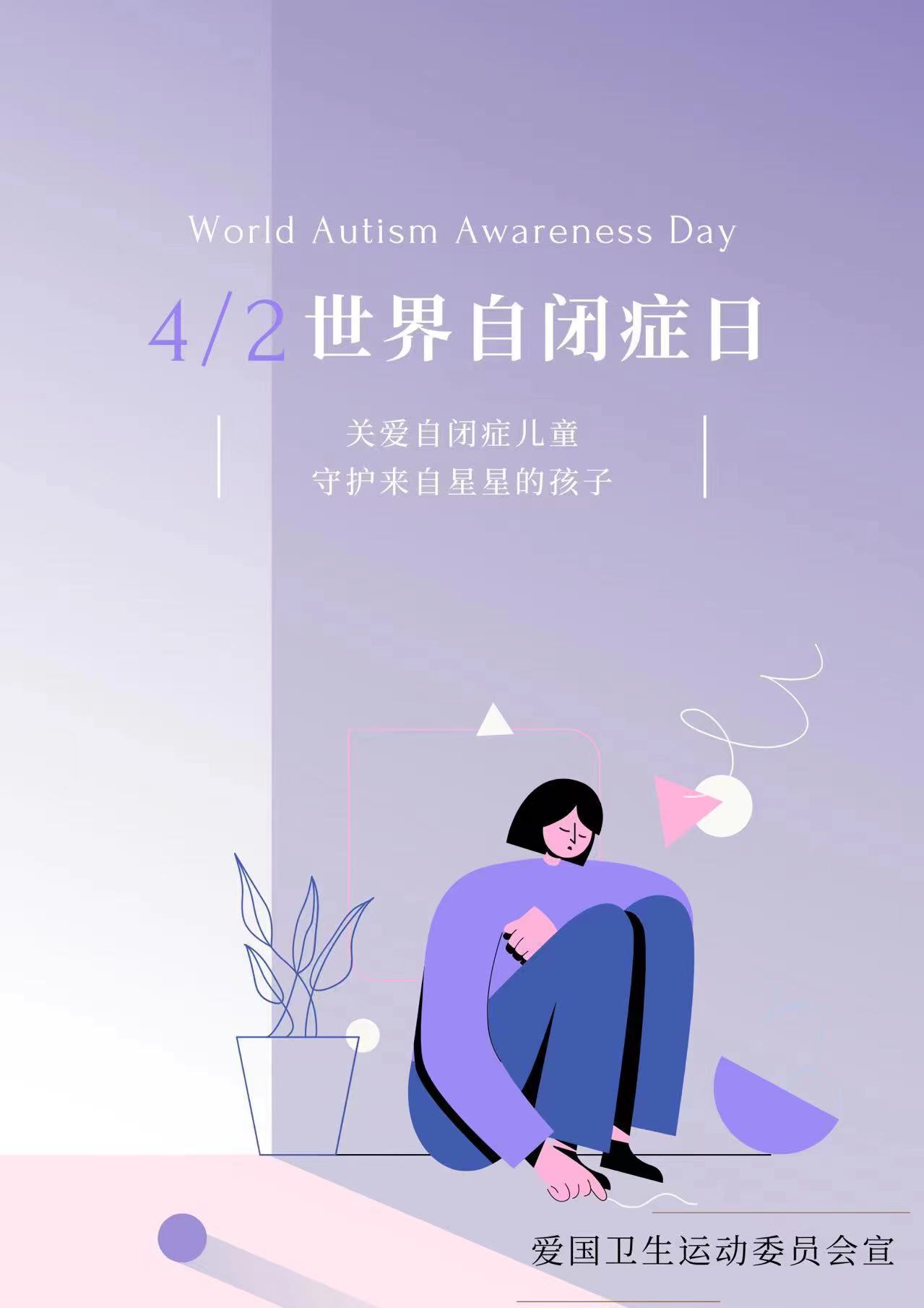 每年的4月2日是世界孤独症日,又称世界自闭症日。爱国卫生运动委员会动员广大同学在各自朋友圈进行宣传关注自闭症儿童,介绍自闭症及诊断和治疗意义