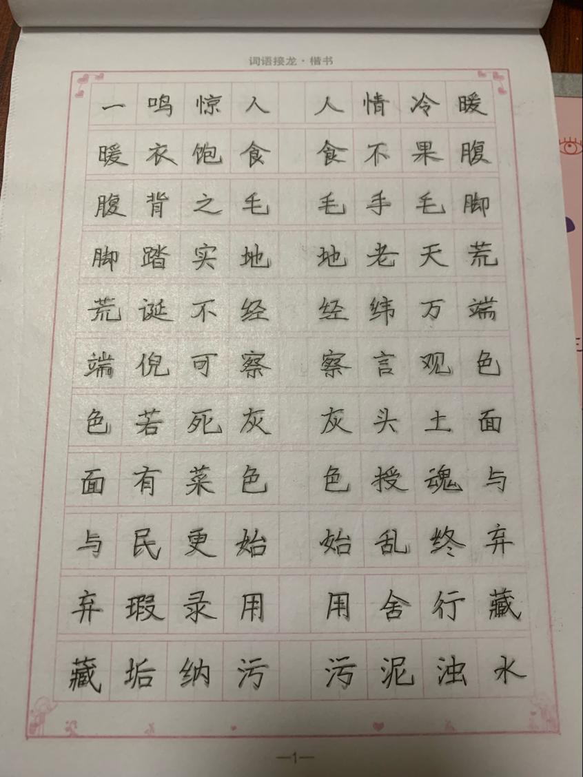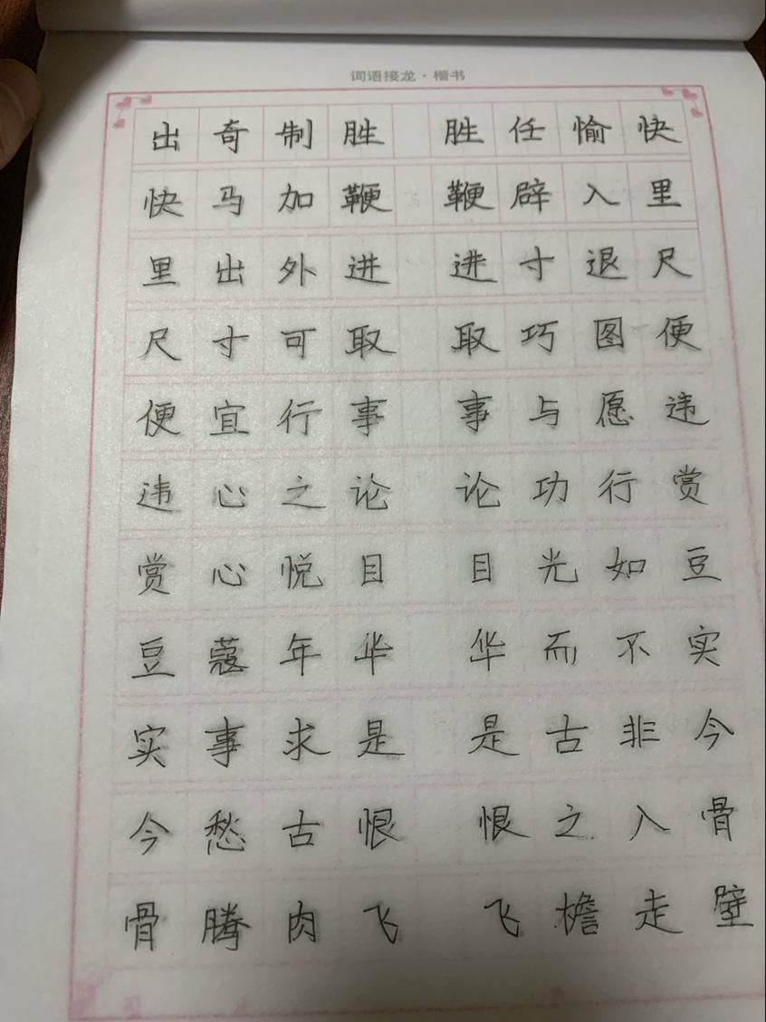 我们组每天都有按时完成一天一篇字帖临摹一篇米子格的书写,每天利用闲暇的时间改进自己的字体,尤其在看见自己的子每天都在改变,就会感觉第四学期的这项必修很有意义。在这个物欲横流的社会里,我们每天都在匆忙地奔波着,能让我们焦躁的心静下来,感受身边的美好。冬日的早晨,暖暖的阳光,临帖,已是我最大的享受。