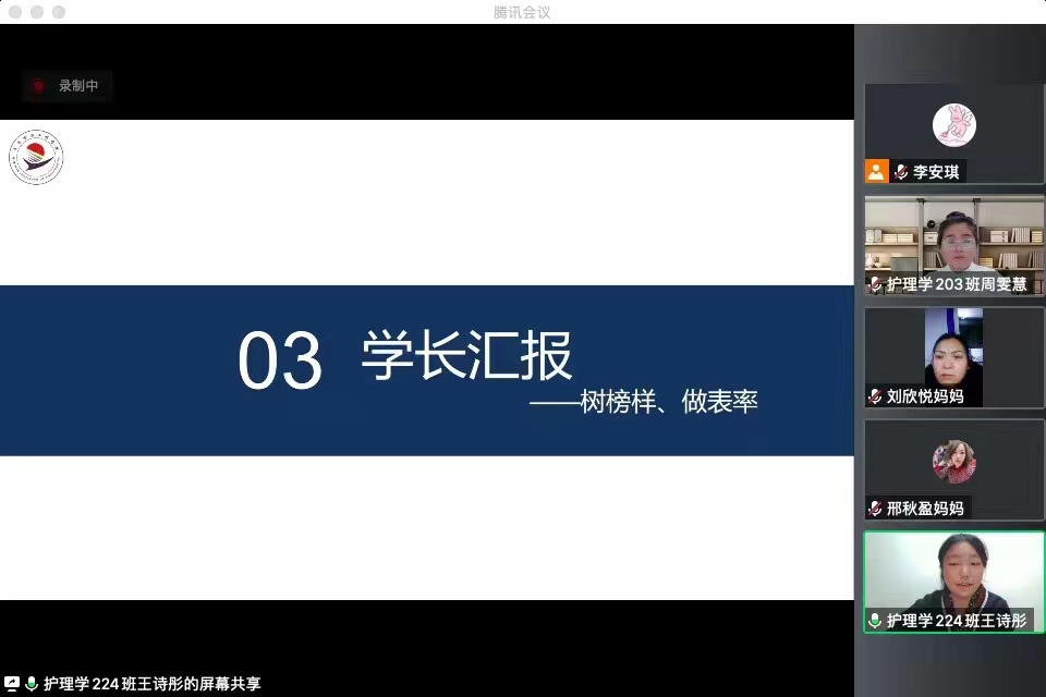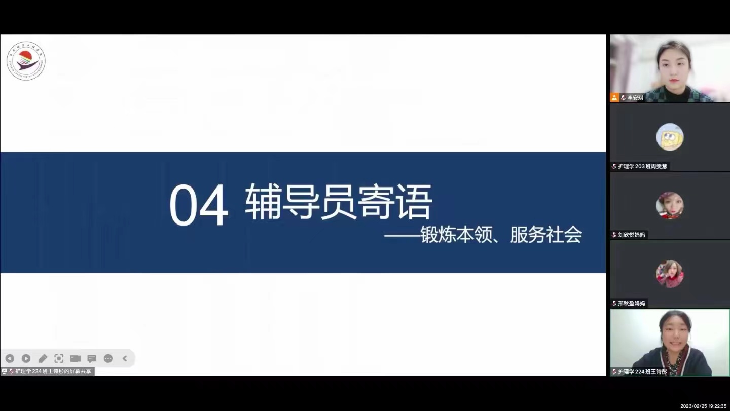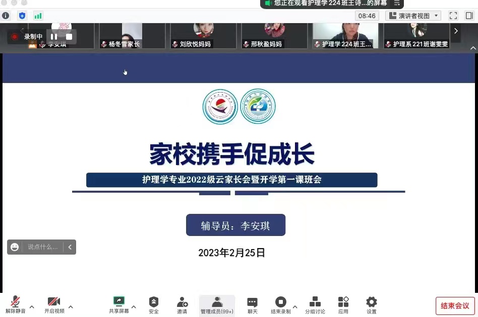 为提高学校与家庭配合度,促进高质量教育教学,护理学2022级于2023年2月25日19:00在腾讯会议组织召开云家长会暨开学第一课。会议由护理学224班王诗彤主持,专业长高悦老师、辅导员李安琪老师、学长周雯慧及护理学22级全体同学和家长参加。