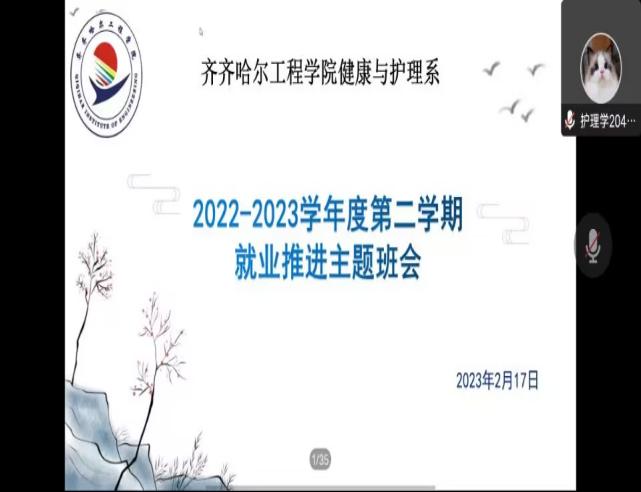 2023年2月17日19时,健康与护理系护理学和护理学专升本专业组织召开就业推进班会,本次会议由健康与护理系辅导员姜宏伟主持,护理学专业长高悦以及护理学专业教师孙晓雪参加,护理学19级及专升本21级毕业生全部参会。