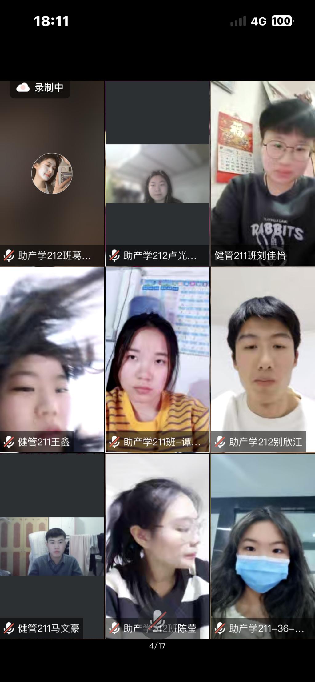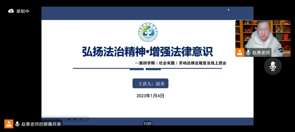 为切实增强同学们的法制观念,提高同学们的道德素质及法律意识。护理21、健管211、助产学211、212于2023年1月4日晚18时联合召开第四学期(社会实践)劳动法律法规线上班会。本次会议由赵勇老师、江丽娜老师主持,护理21、健管211、助产学211、212全体同学参加。