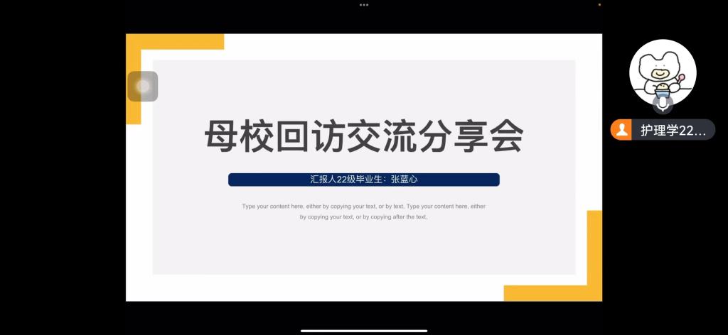 张蓝心同学在回访活动中,通过线上的方式向24级的学弟学妹们分享了她在大学期间所获的的经验和体会,在这两年的大学生活里,锻炼了她的社交能力、沟通能力以及在众多人面前讲话的能力,学习到一些为人处世方面的知。同时,本次交流分享会议也让她收到了很多启发,并且嘱咐学弟学妹要好好学习,不留下任何遗憾。