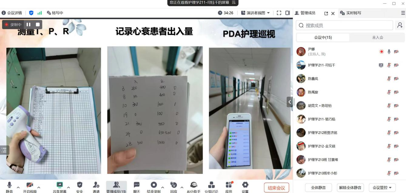会议开始,司钰千同学首先介绍了11月份第1周全体学生实习科室情况,同学们按组分别去了心内一、心内二、心内三科室进行实习,随后司钰千同学简单介绍心内三科的工作内容。会议中,陈鑫岚同学分享了常用药物的注意事项、禁忌症及使用方法,包括血管活性药,舒张血管药,收缩血管药。如何与患者沟通,以及人与人之间的关爱和陪伴对病情恢复的重要性。房颤患者的特征,测量生命体征,PDA的使用。