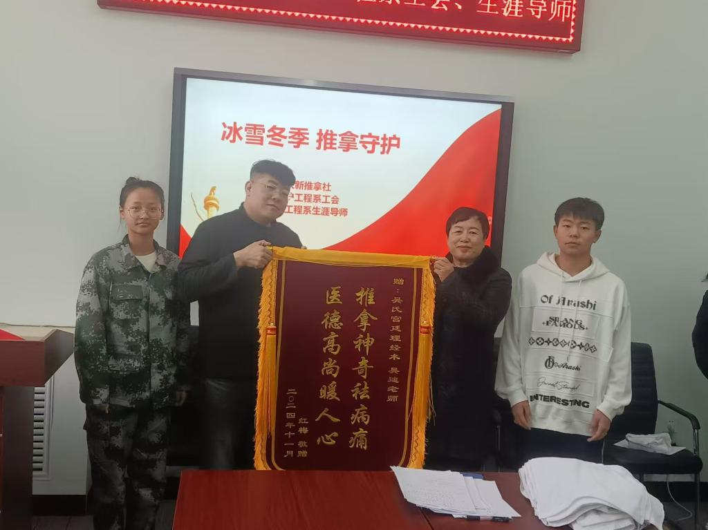 活动中,吴迪老师讲解了冬季养生知识、推拿的基本原理、常用手法及冬季适宜的推拿保健方法。吴迪老师现场演示几种简单易学的推拿手法,并指导同学们为生涯老师们进行实际操作。在推拿手法展示环节,同学们用娴熟的专业按摩技术为老师们“搓、揉、拿、捏”。他们一边操作,一边为老师讲解每个手法的要点和适用情况,解决老师们的腰酸背痛问题。同时,还仔细询问老师们的身体状况,针对不同情况提出了针对性调养意见,并将一些简单的理疗手法告诉老师。恰到好处的推拿手法,不仅调节了老师们因长期伏案工作而紊乱的身体机能,还通过温柔的推拿按摩,舒缓了老师们紧绷的肌肉,极大地缓解了他们的身体酸痛与疲惫。老师们对此赞不绝口,纷纷表示感受到了来自学生们的温暖与关怀。活动结束后,各位老师写下了对同学按摩的评价。同时,杜红梅教授为吴迪老师颁发锦旗,以表彰他在推拿教育和实践领域所做出的杰出贡献。大新推拿社的同学用优秀的服务和耐心的态度得到了生涯老师的一致夸赞,为生涯老师们送上了初冬的温暖。