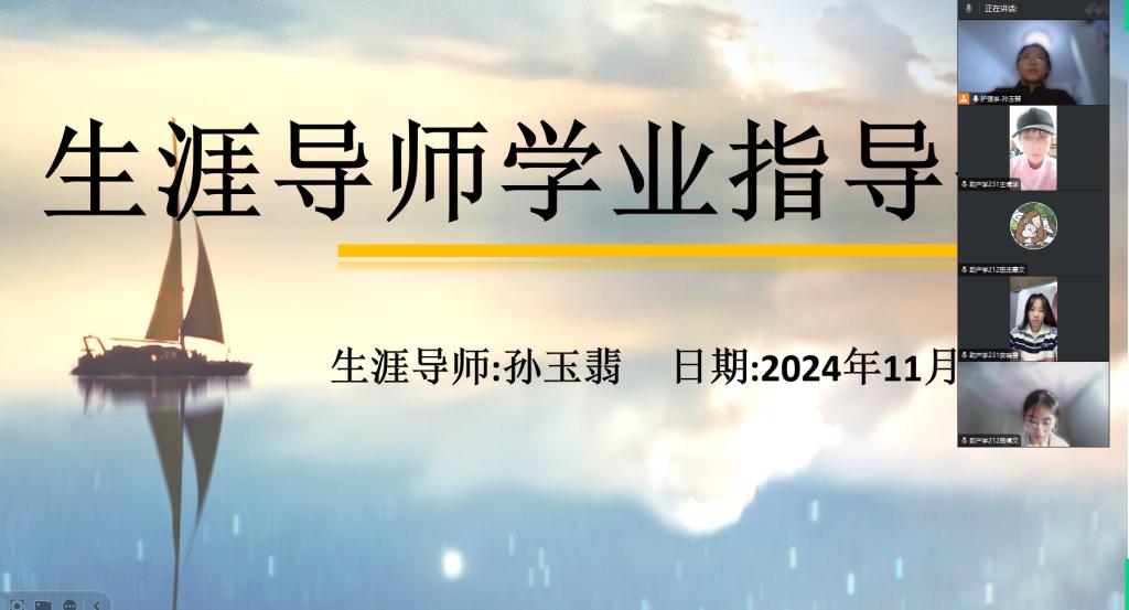 为了帮助学生顺利完成学业,明确个人发展目标。促进学生间的学习交流,帮助学生科学有效的进行学习。2024年11月14日20点,生涯导师孙玉翡于腾讯会议组织开展生涯学生学业指导会,本次会议生涯组学生全员参加。