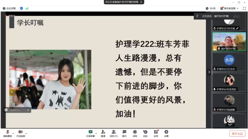 最后,尹娜老师提醒同学们,要按时完成手册,制定学习计划,积极参加学校比赛积攒二课学分,为毕业做准备,同时提醒大家注意天气变化,增添衣物。此次会议促进了师生交流,为同学们提供了宝贵的学习生活经验,更为未来发展指明了方向。
