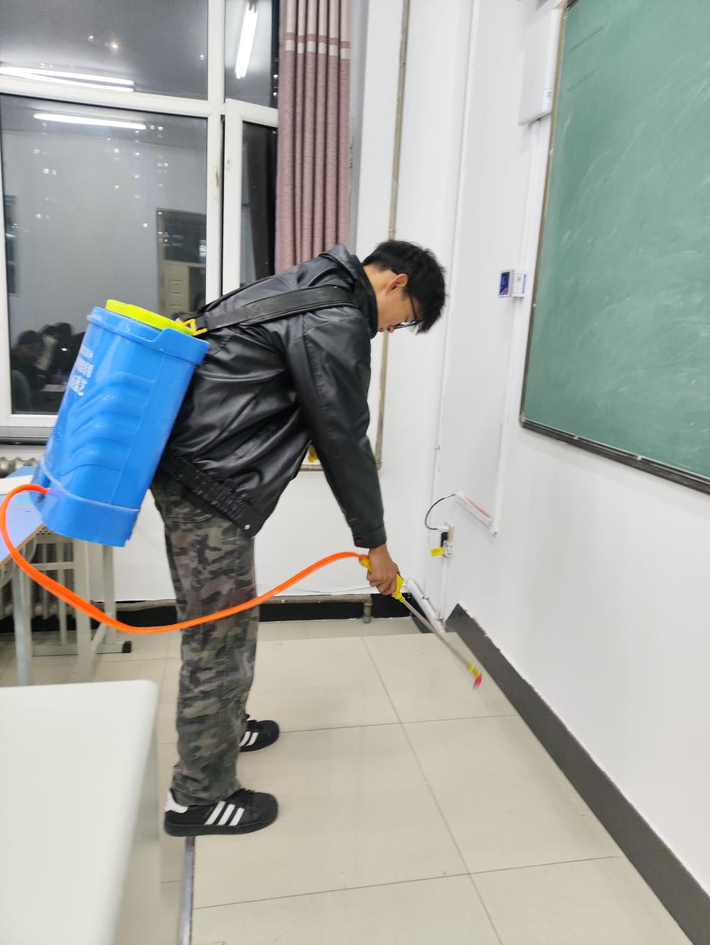 其次就是每周至少一次的消毒作业,负责同学在穿戴好消毒装备后,采用高效环保的消毒液,对课桌椅、门把手、开关面板等高频接触区域进行全面喷洒擦拭。