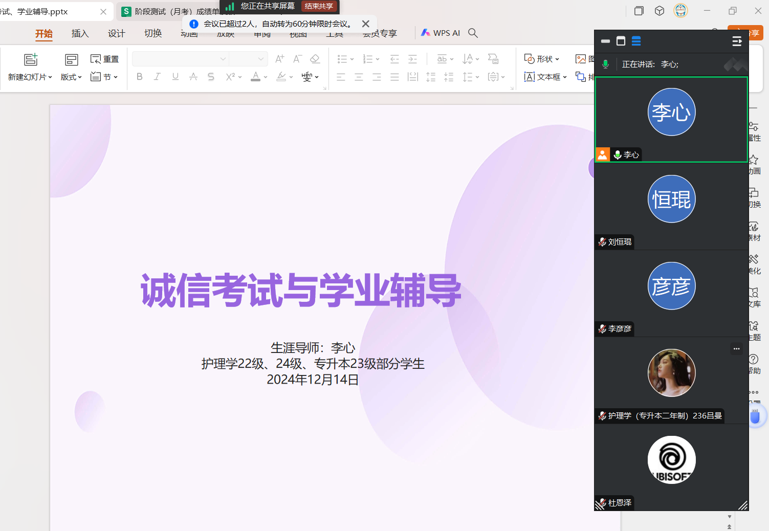 为了引导学生诚信考试,并提高学生学业水平,2024年12月14日,生涯导师李心召开诚信考试与学业辅导会议,护理学22级、24级及专升本等部分学生参加。