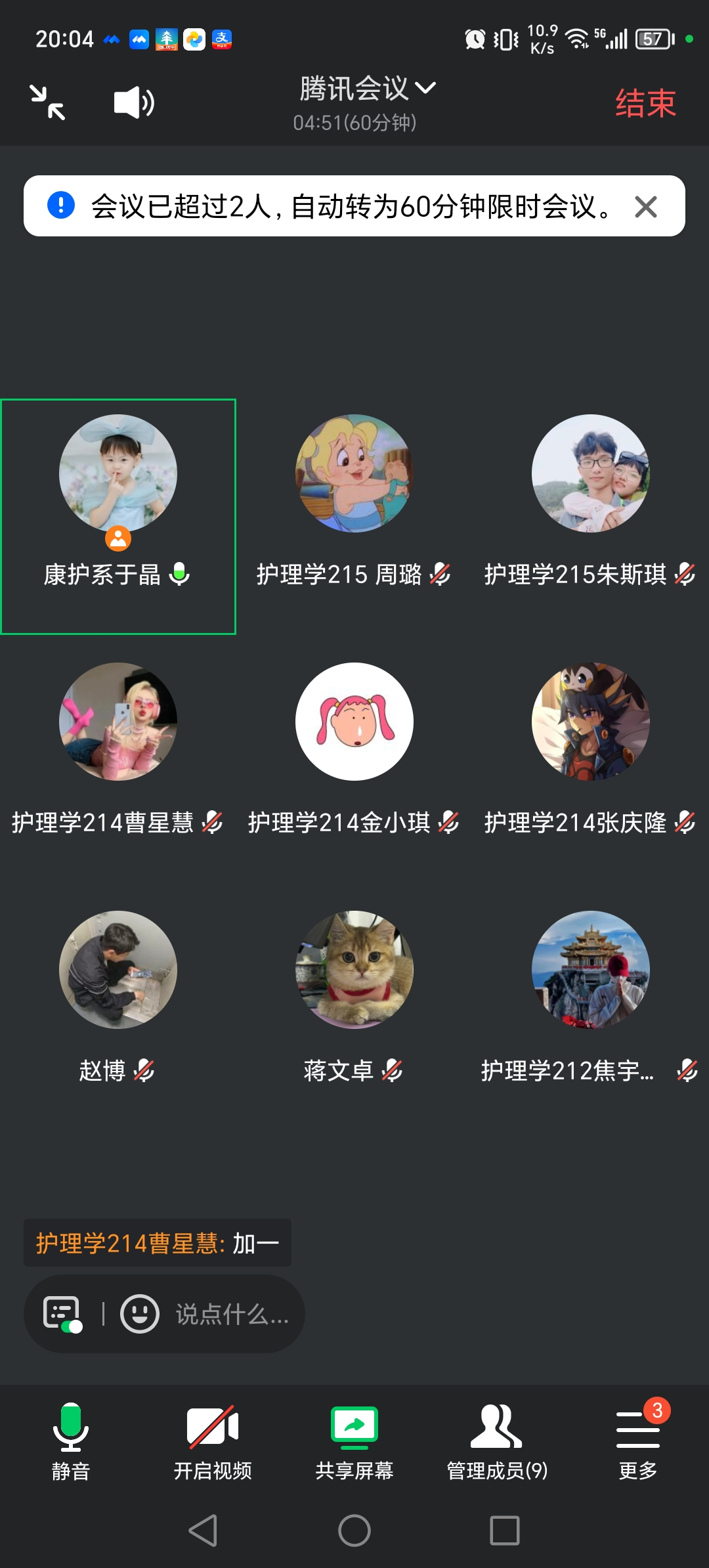 会议开始,于晶老师邀请大家每个人谈论一下实习和就业方面,生活中遇到的问题等。其中在哈尔滨中国人民解放军联勤保障部队第962医院实习的焦宇贺同学讲述了实习科室的医疗环境,教学设施以及科室的日常安排等。蒋文卓同学提到在校园系统创新创业录入方面的疑虑和困惑。张庆隆同学表示要考公安的编制。在中国人民解放军总医院301实习的周璐同学则提到在北京301医院见到了很多新奇的病例和仪器,这里更看重礼仪与护理质量,自己学到了很多沟通的技巧。在大家激烈的讨论声中,也让远在各地的同学有了温暖的感觉。