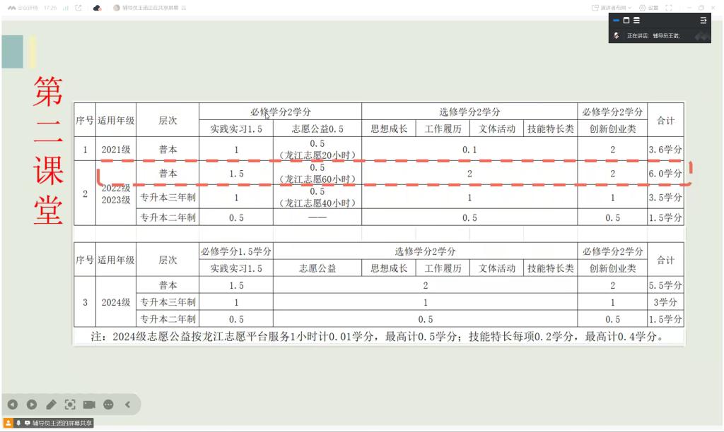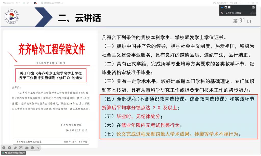 最后,专业负责人孙晓雪老师围绕专业建设和毕业要求展开讲解,详细介绍了微专业招生情况、课程设置及要求。孙晓雪老师着重强调了获取毕业证书和学位证书的相关条件,让学生明确学习目标,为未来的学习生活做好规划。