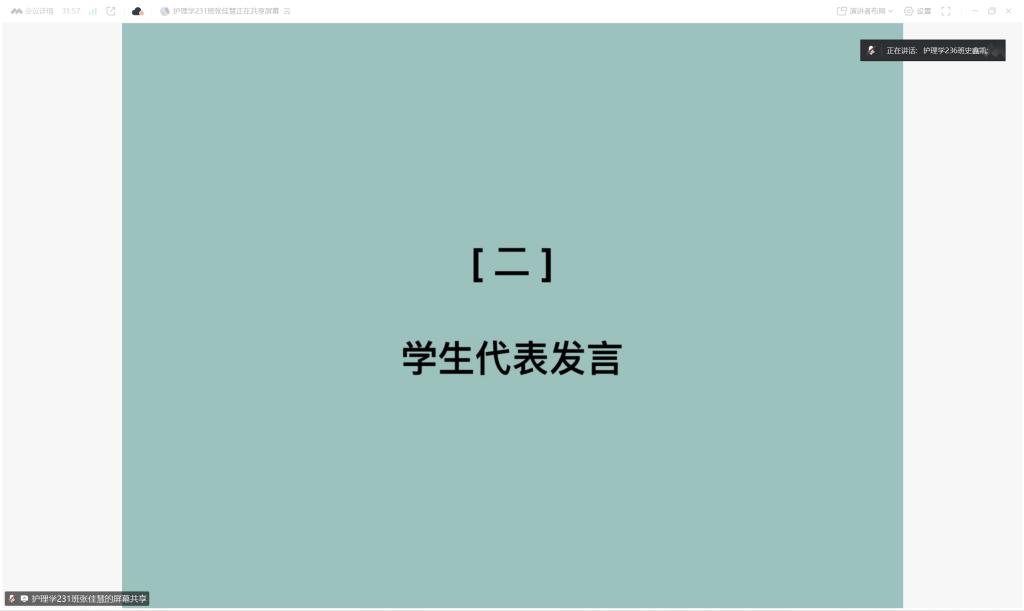 会议的下半程,护理学236班的史鑫凯同学作为学生代表发言。他结合自身经历,分享了自己在社会实践、专业课程学习以及学习方法上的经验。他的分享生动具体,为同学们提供了宝贵的学习参考。