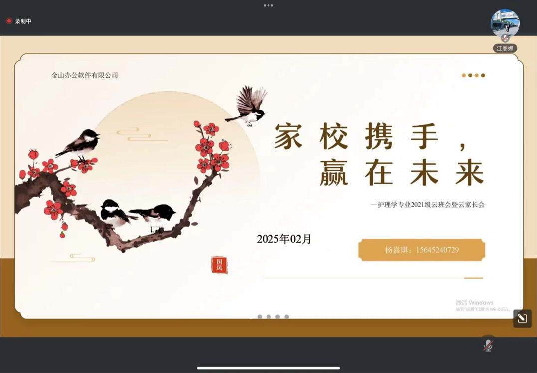 2025年2月24日,齐齐哈尔工程学院2021级护理学专业成功举办了一场别开生面的云班会暨云家长会。本次会议旨在加强家校沟通,共同探讨学生成长成才的路径,确保每位学生都能顺利获取毕业证书和学位证书,同时加强安全教育,确保学生在校期间的安全与健康。会议由护理学21级辅导员杨嘉琪、江丽娜组织,专业长孙晓雪及全体生涯导师参会。