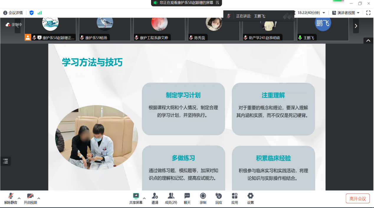 王鹏飞学长的分享不仅让同学们看到了他在学习和工作中的努力和坚持,更为同学们指明了前进的方向。相信在他的指引下,未来的学弟学妹们定能在医学护理领域取得更加辉煌的成就。