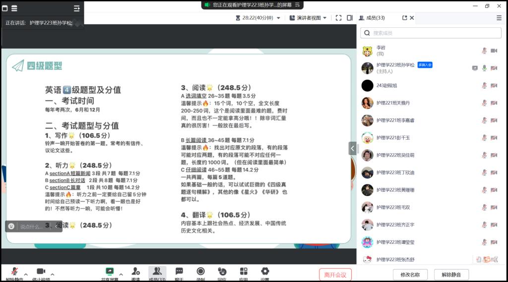 2025年3月11日,李岩老师组织生涯学生在腾讯会议上,邀请护理学专业223班孙学松同学进行了线上英语四级分享会,此次分享会为即将参加英语四级考试的同学们提供宝贵的备考经验和学习技巧。