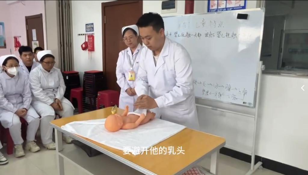 助产学专业的实训焦点则聚焦于婴儿抚触。实训室内,学生们分组练习轻柔而精准的手法,从额头轻抚到背部按摩,导师示范如何通过抚触促进婴儿神经系统发育并稳定情绪。学生们轻声哼唱摇篮曲,模拟真实照护场景,体会母婴关怀的温度。