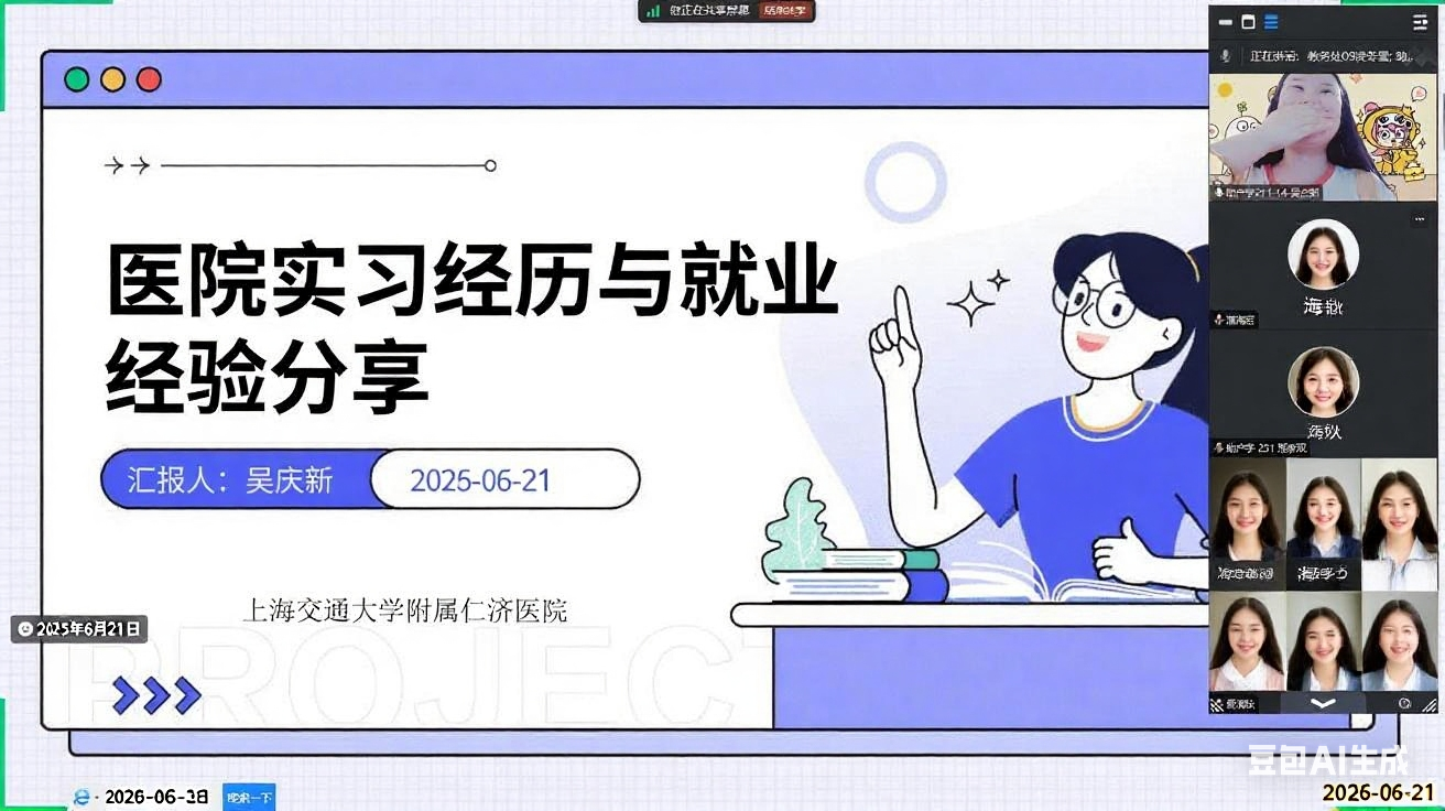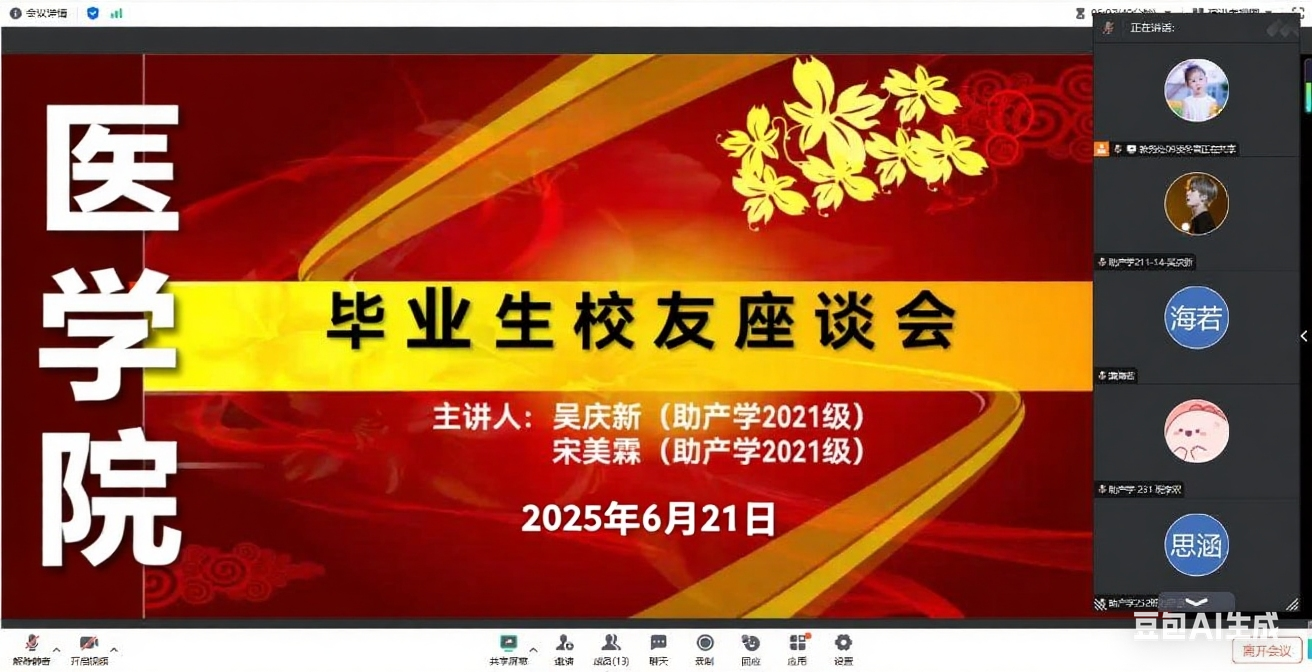 6月21日,生涯导师凌冬雪组召开线上毕业生校友座谈会,邀请助产学2021级吴庆新和宋美霖为大一、大二同学讲解自身的经历与求职经验,共计15人参与此活动。