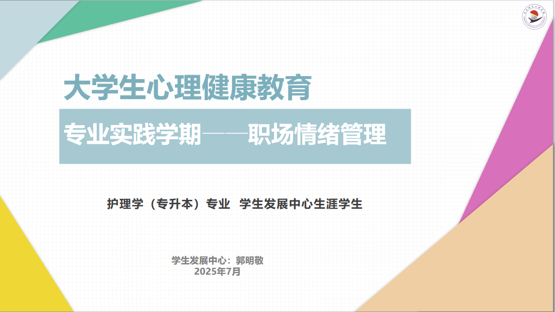 为助力学生顺利度过专业实践学期,提升实践中的职场适应能力,7 月 28 日,学生发展中心郭明敬老师为护理学(专升本)专业及学生发展中心生涯学生,专题开展 “专业实践学期 —— 职场情绪管理” 讲座。