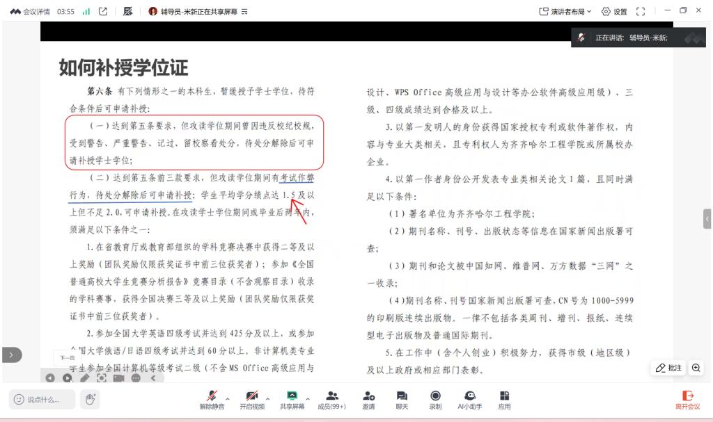 会议伊始,辅导员米新围绕本学期教学校历,详细介绍了返校报到、入学教育及上课时间,明确各项安排与补考、考试周节点。随后,辅导员米新从返校前后的复习、安全、健康、仪容仪表等准备工作,到德育学分管理办法、降级制度、学士学位授予与撤销条件,逐项进行解读,强调护理学专业规范与学业要求并结合2025届毕业生就业数据,分析就业形势,介绍就业信息获取途径及我校研修生院的培养模式与待遇,为学生毕业方向提供参考。最后,专业负责人苏森森针对学生毕业与综合素质培养重点内容进行补充:一方面着重强调学士学位授予的核心条件,提醒家长关注学生学业进度;另一方面详细介绍“到梦空间”第二课堂,说明选修课选课流程与学分要求,同时鼓励学生积极参与志愿服务活动以提升社会责任感,动员学生报名创新创业比赛锻炼实践能力与创新思维,为学生综合素质提升与未来发展提供方向指引。