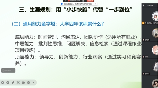在“生涯规划”部分,吴老师打破了“规划太早”“专业即职业”“追求完美目标”三大常见误区,提出“小步快跑”的行动理念。她通过“通用能力金字塔”模型,引导学生从底层能力(如时间管理、沟通表达)逐步向顶层能力(如领导力、行业洞察)迈进,并推荐了“探索—设定—复盘”的三步规划法。