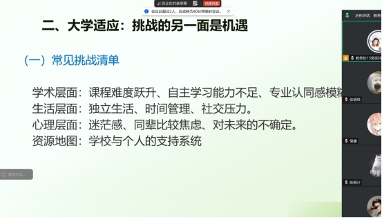 吴宪玲老师还以线上腾讯会议形式,开展“大学新起点:适应・规划・成长”主题生涯启航会,为新生介绍生涯导师职责、解析大学适应挑战与生涯规划方法。