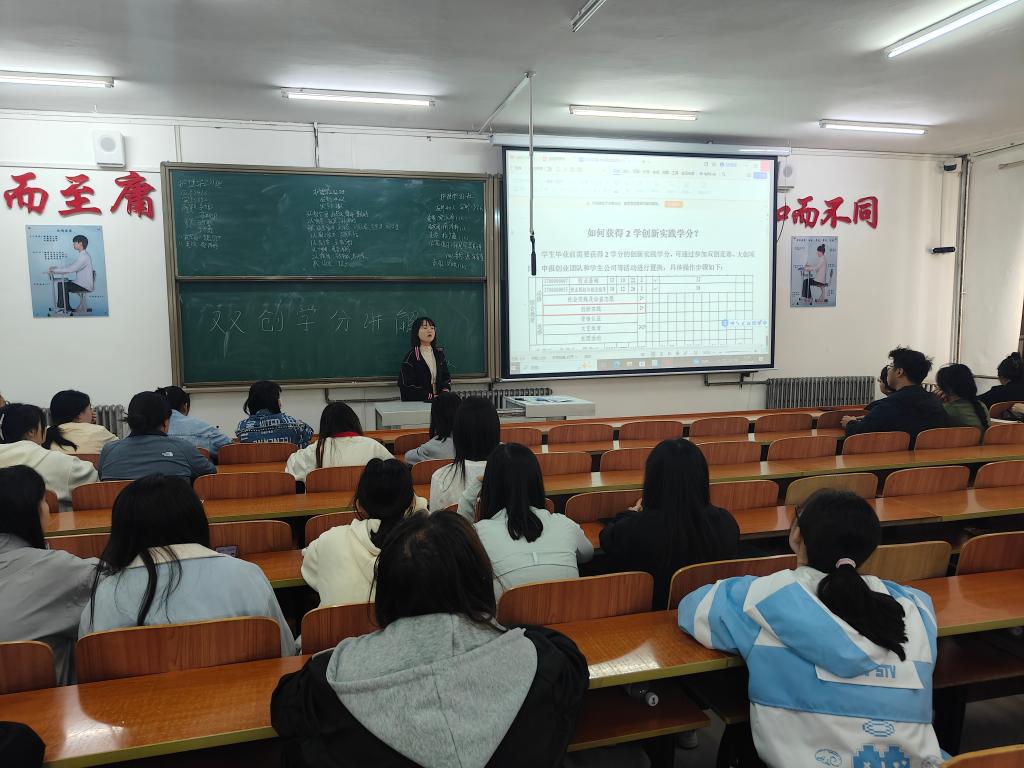 会上,王诺老师首先对双创学分的分类及对应分值进行梳理。科技创新类涵盖学科竞赛、学术研究、专利等多个板块,例如学科竞赛国家级及以上奖计2学分,学术研究中国际学术期刊论文计2学分;社会实践及公益志愿类需修满2学分,由第四学期公益活动、志愿服务等项目构成;资格认证类包含外语、计算机等多种认证类型,不同类型学分可累计,同一类型以最高学分为准。随后,王诺老师针对申请流程和佐证材料进行了实操性讲解。学生需登录“校内个人信息门户”,进入实践教学系统,在“实践创新学分”板块查看综合教育课程安排表,再通过“信息填报管理”模块,根据自身参与的双创活动进行信息填报。同时,她强调不同项目需准备对应的佐证材料,如学科竞赛需提供获奖证书,专利需提供专利证书,志愿服务需提供服务时长证明等,确保材料真实且完整,以便顺利完成学分申请。