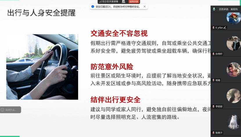 安全是假期的首要前提。吴老师从出行安全、财产安全及身心健康三方面作出了细致叮嘱。她反复强调,同学们无论返乡、旅游或留校,都务必时刻将人身安全置于首位,警惕电信诈骗,保持规律作息与健康心态,确保度过一个平安、祥和的假期。