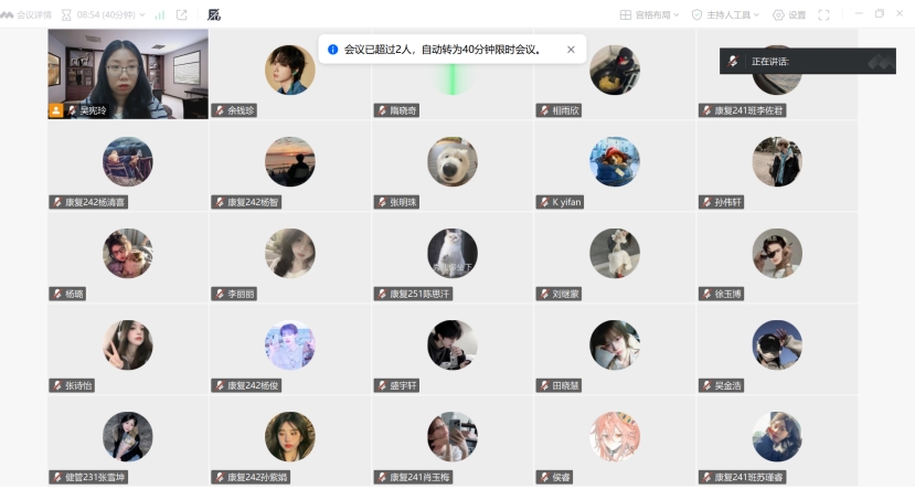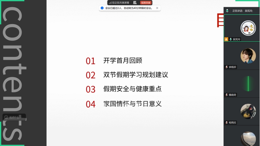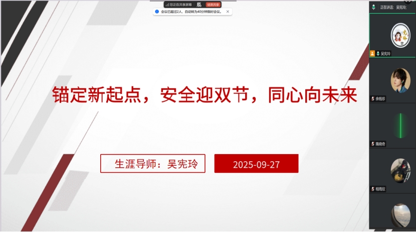 国庆、中秋双节临近,为引导学生总结复盘开学初期的学习生活,强化假期安全意识,并做好未来规划,2025年9月27日,生涯导师吴宪玲通过腾讯会议平台,为所负责的康复治疗学与健康服务与管理专业全体生涯学生组织召开了以“锚定新起点,安全迎双节,同心向未来”为主题的生涯指导会议。