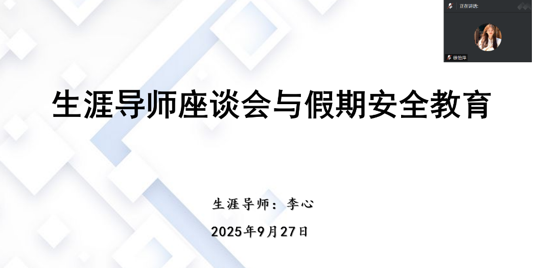 为强化学生假期安全意识,保障国庆假期平安有序,9月27日,生涯导师李心组织开展“国庆假期安全”主题活动及座谈会。