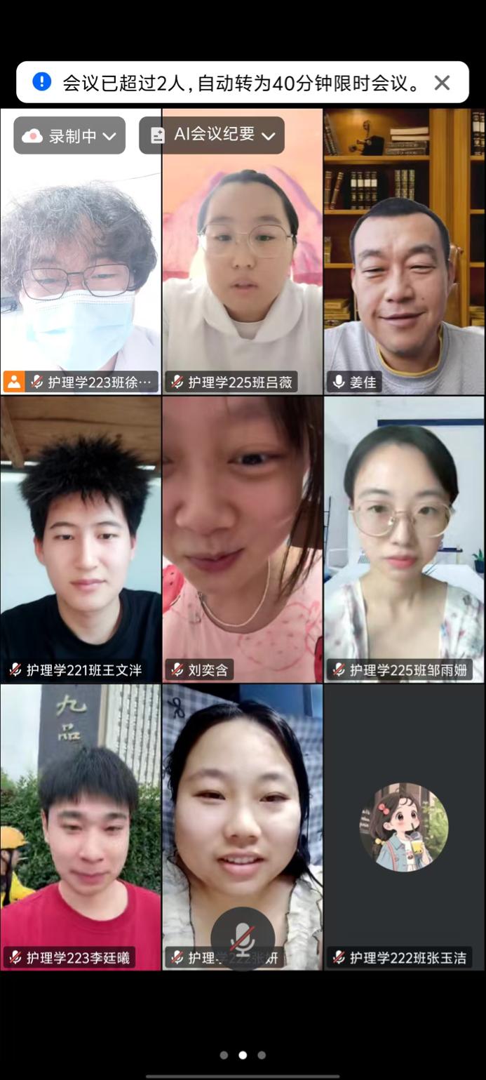 2025年9月26日,为及时响应实习学生反馈问题、助力学生规划职业方向、筑牢假期安全防线,姜佳老师组织南京东部战区总医院、江苏大学附属医院的实习学生召开线上实习专题会议。会议围绕“实习问题反馈与解决”“就业指导建议”“假期安全提醒”三大核心议题展开。