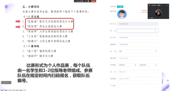 生涯导师张道勇重点解读了竞赛项目设置,结合学生所学专业及擅长领域,建议学生考虑参加“民族魂”数字艺术创新创意设计大赛和“职场秀”职业生涯规划大赛,并明确了这两种大赛的报名程序、作品要求及注意事项。