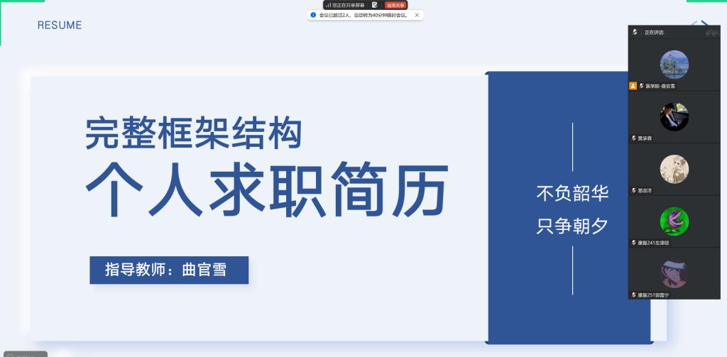 为积极响应学校就业指导工作要求,助力学生提升就业竞争力,11月20日,由生涯导师曲官雪组织主讲的“职业启航,简历研习”主题指导活动在线上成功举行。