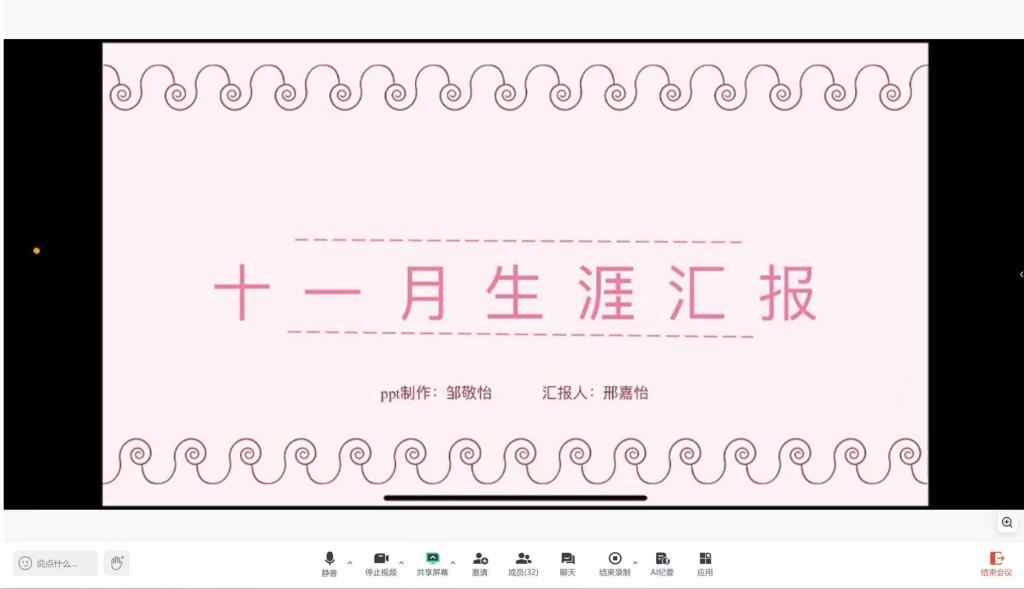 2025年11月30日,尹娜老师通过腾讯会议主持召开十一月生涯会议,会议聚焦期末备考,整合十一月学习生活复盘、复习方法指导与考风考纪强调,为同学们明晰了备考方向。