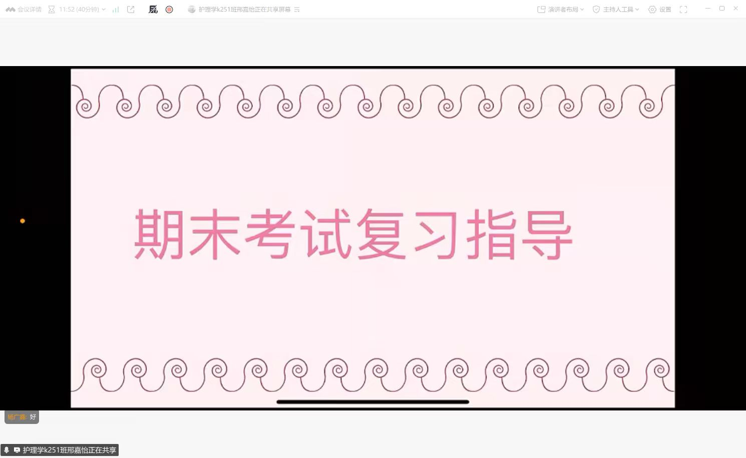 会议伊始,护理学K251班刑嘉怡同学结合自身经历进行十一月生活分享,她从课堂学习、社团活动、日常作息等方面,客观讲述了自己本月的学习生活状态,既分享了合理平衡学习与活动的经验,也坦诚剖析了自身存在的时间分配不足等问题,为同学们提供了可借鉴的生活参考。在学生分享结束后,尹娜老师结合期末备考需求,为全体同学开展复习方案指导,她提出要根据自身学情分层制定复习计划、聚焦学科内容强化重难点突破、科学规划作息做好时间管理、通过定期自测检验复习效果,帮助同学们搭建起系统的备考框架。