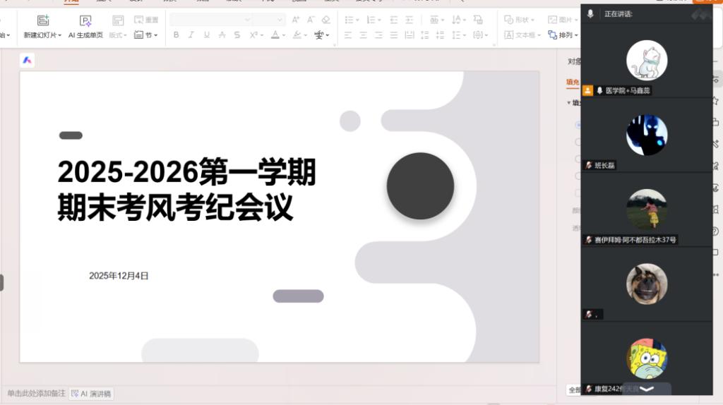 2025年12月3日,期末考试临近之际,为强化学生诚信意识,严明考试纪律,营造公平公正的考试氛围,生涯导师马鑫蕊老师通过线上会议组织全体学生开展“诚信应考,不负韶华”考风考纪主题会议。会议围绕考试规范、违纪后果、诚信意义及备考方法展开,引导学生以端正态度迎接期末检验,以诚信品格筑牢成长根基。