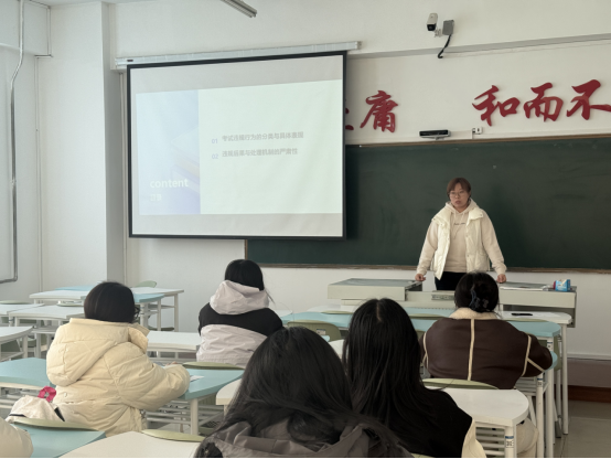 随后,她详细解读《学生考试违规处理办法》核心条款,结合作弊典型案例,剖析作弊导致的取消成绩、记过处分等学业后果及长远职业影响,让学生深刻认识“一次作弊,终身污点”的严重性。