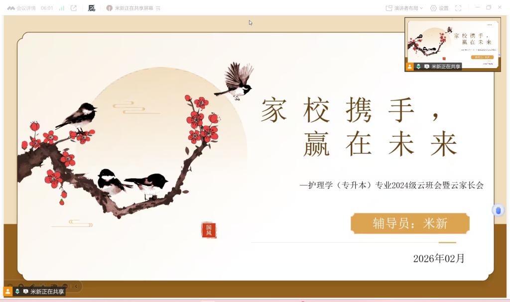 为搭建家校协同育人桥梁,帮助学生和家长明晰新学期教学安排、返校要求、毕业学分及学位授予细则,精准规划学业与职业发展,医学院2024级护理学(专升本)专业于2月25日16:40通过腾讯会议召开云班会暨云家长会,会议由辅导员米新主持,专业负责人苏森森、医学院2024级护理学(专升本)专业全体学生及家长参加。