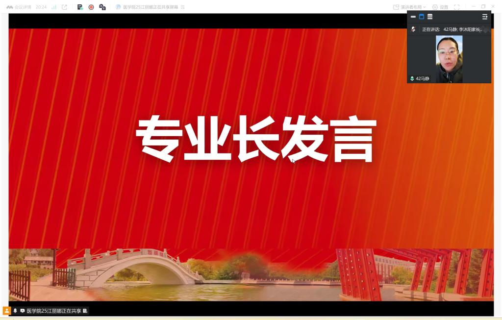会议伊始,江丽娜老师介绍了本次会议的目的。她表示,随着医学教育改革深入和就业门槛提高,帮助学生系统了解各阶段学业重点和就业形势十分必要,希望通过家校沟通形成育人合力,助力学生顺利从校园走向职场。