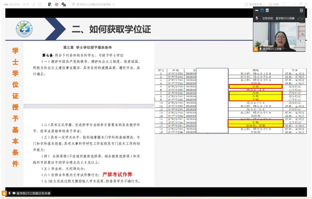 辅导员江丽娜老师解读了毕业与学位授予要求。她介绍了成绩评定标准和平均绩点计算方式,强调实习表现对绩点的关键影响,提醒学生需在毕业实习前修满10学分选修课。在学位授予方面,她说明了毕业证和学位证的获取条件,以及绩点在1.5至2.0之间学生可通过竞赛获奖、发表论文等方式申请学位补授的政策。