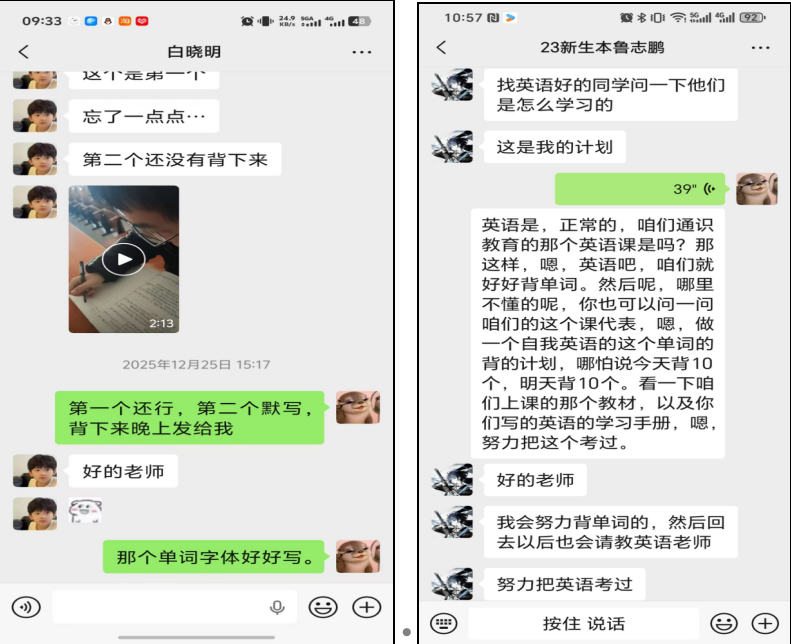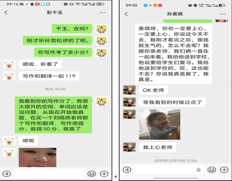“以学生为中心”是李岩老师作为生涯导师的核心理念,她用细致入微的关怀与科学有效的引导,陪伴学生逐梦前行。在学业指导中,她针对学生薄弱科目精准帮扶,通过微信一对一沟通,为彭千玉推荐备考资料,为鲁志鹏制定英语背单词计划,督促孙美琪、白晓明考前复习,用耐心助力学生突破学习瓶颈。